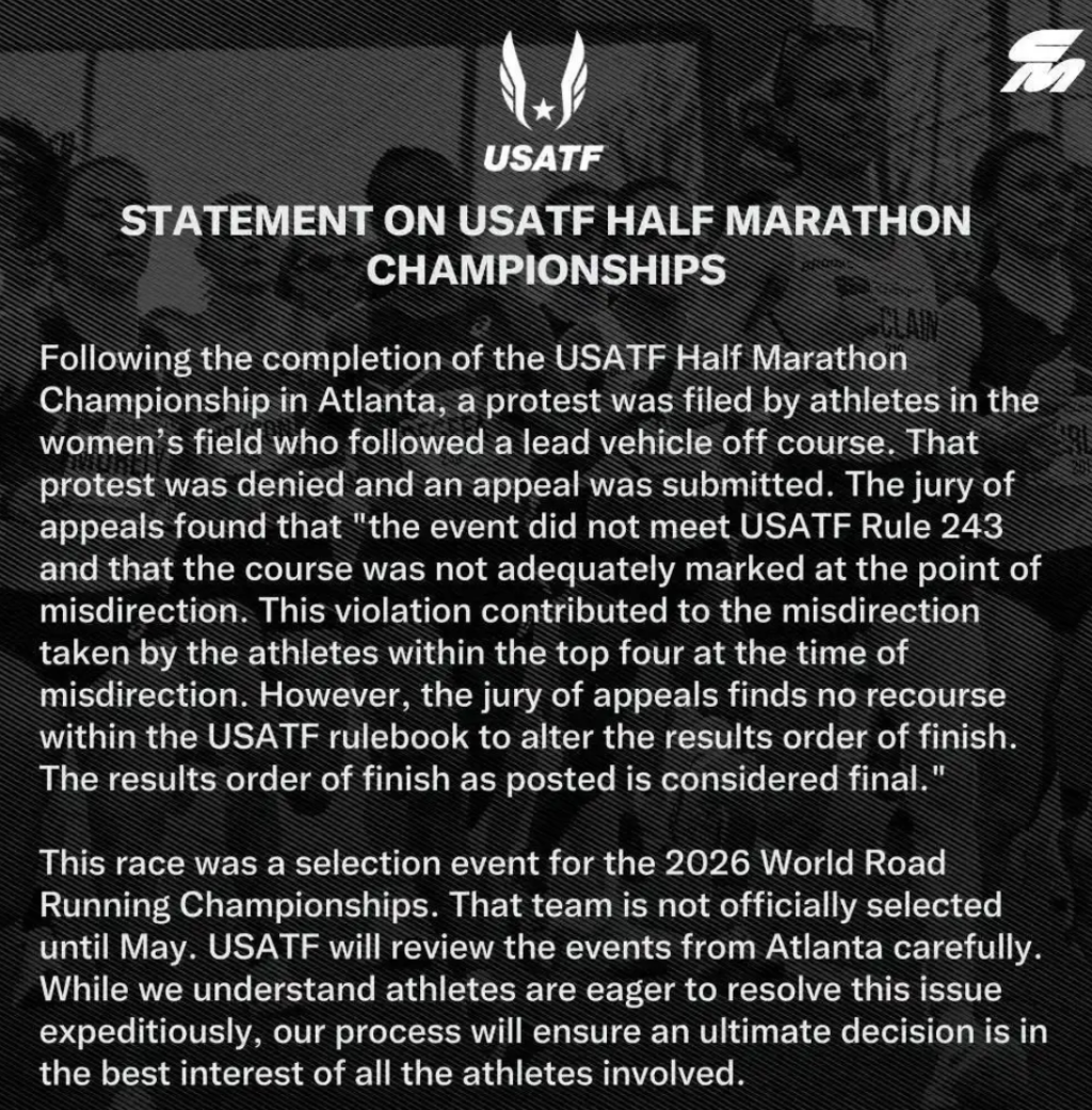 据《Runner’s World》报道,美国田径协会(USATF)在赛后发布声明称,部分运动员对比赛的组织提出了抗议,但是被驳回了申诉,随后,这几位运动员又进行上诉,而上诉审核委员会的最终裁定结果是,“比赛中所发生的问题违反了美国田径协会规则第243条,而且在引导车出现偏离时赛道标记不足,这些违规行为导致了领先的选手被误导。然而,根据美国田径协会规则手册,无法更改最终成绩排名。已公布的成绩排名将被视为最终结果。”